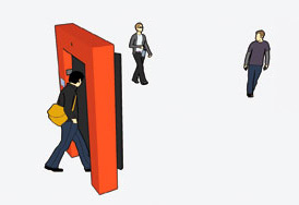 Durch ein klanglich begleitetes Betätigen der Tür werden Aufnahmen von ihrem Umfeld erzeugt und in das Netz gespeist. Dabei bezieht sich die Installation auf eine besondere Eigenschaft von Netzwerken, nämlich auf die Tendenz, sich selbst in den Rücken zu fallen: Hohe Vernetzungsdichte bedeutet im Grunde einen positiven Befund für die "Vitalität" eines Netzes. Zugleich erhöht sich dadurch der Inflationsgrad der Differenz; das System neigt zur Sättigung und nähert sich dem Netzwerkrauschen.